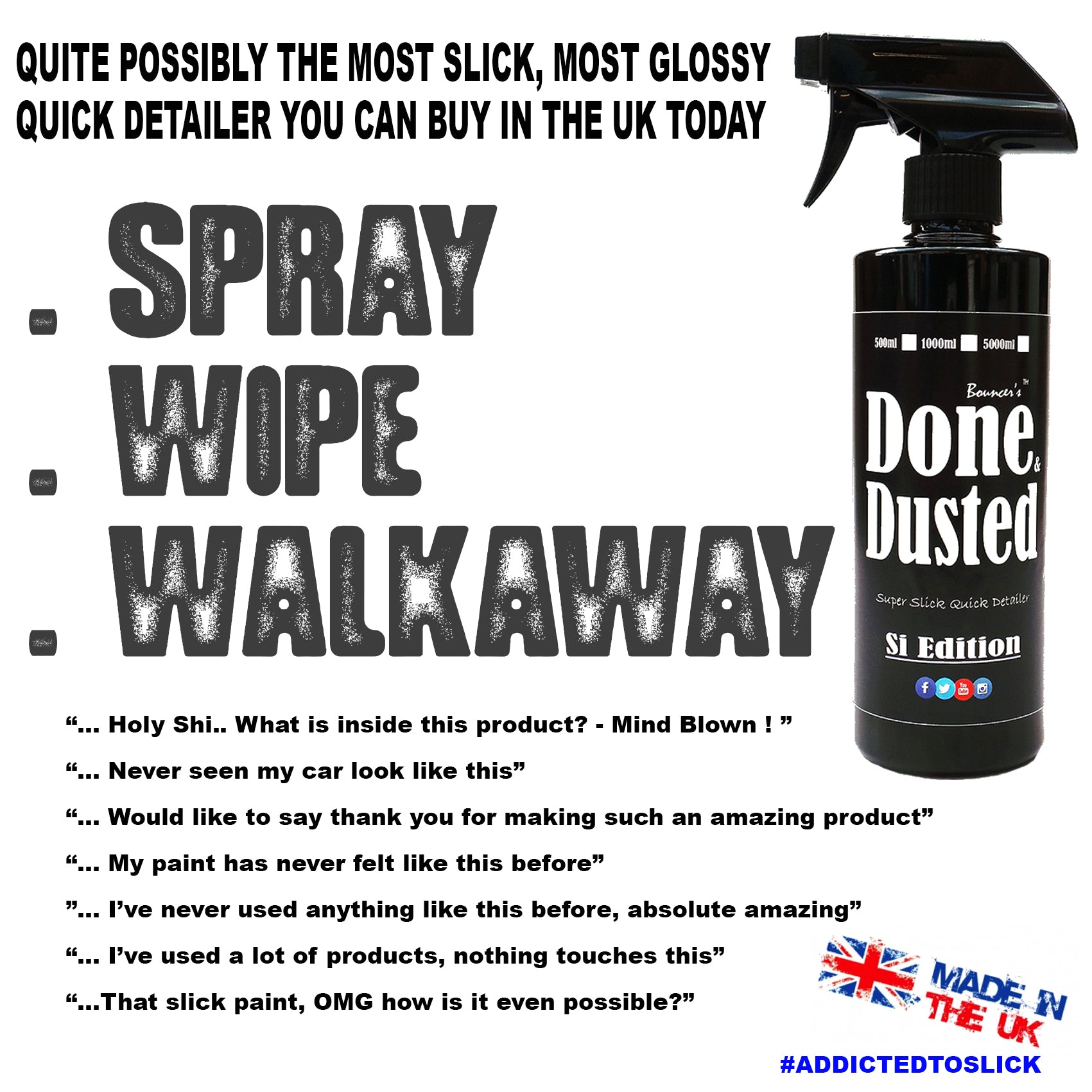 Bouncers Done & Dusted Si Edition Detailer will add a protective, extremely slick coating to your vehicle and prevent the build-up of contaminants.